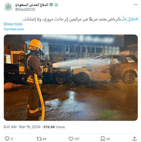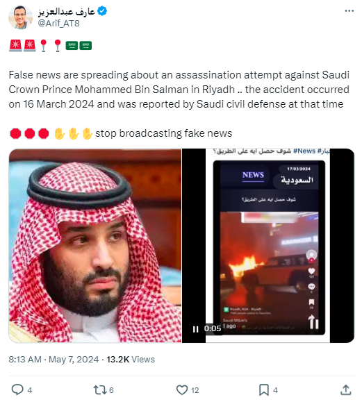البتہ یہ ویڈیو کس حادثے کی ہے، اس بارے میں گوگل پر کیورڈ سرچ کیا تو ہمیں سعودی شہری دفاع کے ایکس ہینڈل پر شیئر شدہ وائرل ویڈیو سے ملتے جلتے تصویر کے ساتھ ایک پوسٹ ملا۔ جس میں اس تصویر کو ریاض میں ٹریفک حادثے کا بتایا گیا ہے۔ جہاں دو گاڑیوں میں آپس میں ٹکرانے کی وجہ سے آگ لگ گئی تھی، اس حادثے میں کوئی جانی نقصان نہیں ہوا تھا۔ اس کے علاوہ کئی غیر ملکی صحافیوں نے بھی اس ویڈیو کو ریاض میں ہونے والے سڑک حادثے کا بتایا اور محمد بن سلمان پر قاتلانہ حملے کو جھوٹا قرار دیا ہے۔