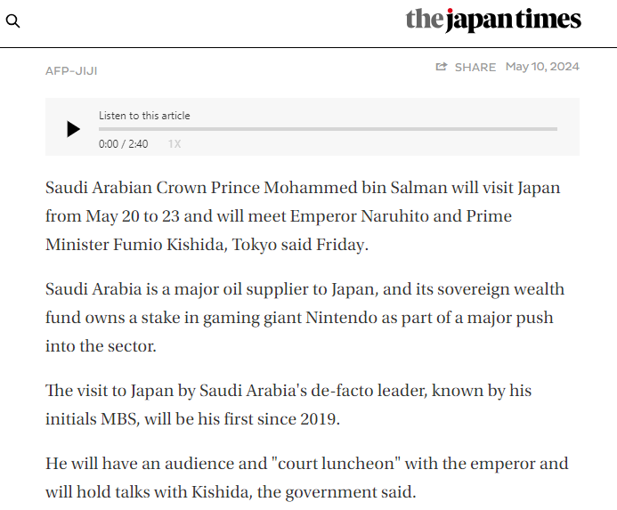 اس کے علاوہ ہمیں آج یعنی 10 مئی کو شائع دی جاپان ٹائمس کی ایک رپورٹ موصول ہوئی۔ جس کے مطابق سعودی ولی عہد محمد بن سلمان رواں ماہ کی 20 تاریخ کو جاپان دورے پر جائیں گے۔