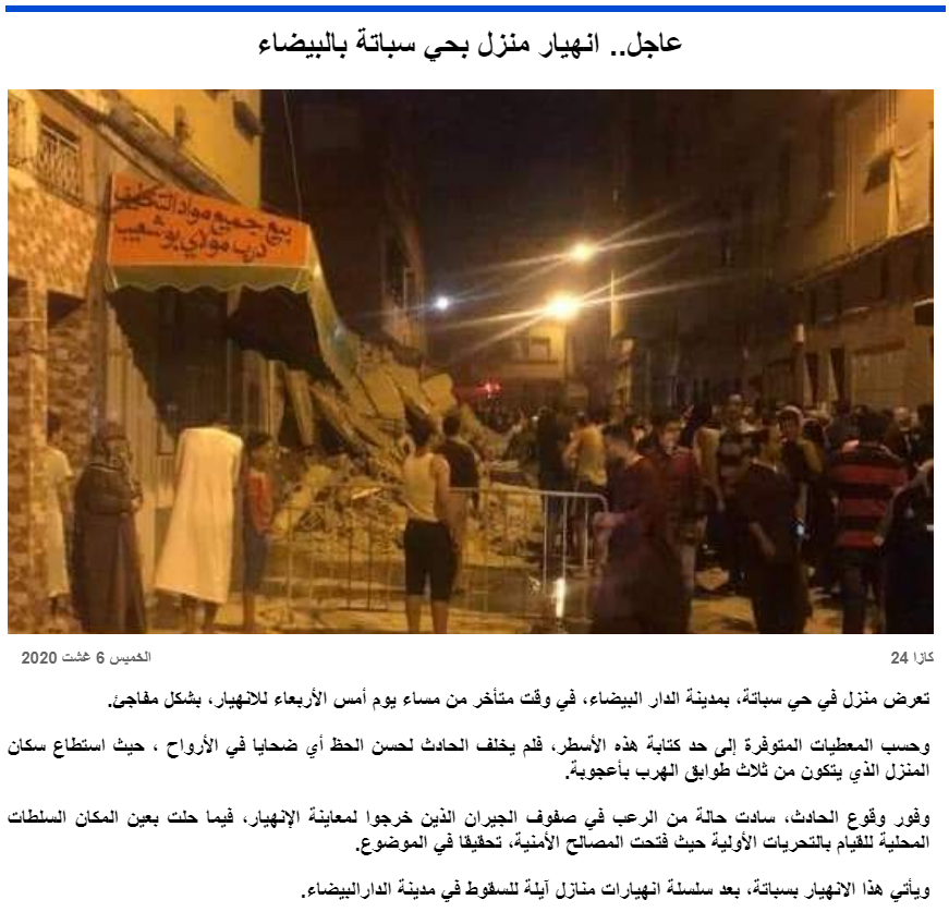 مزید سرچ کے دوران ہمیں وائرل ویڈیو سے متعلق مراکش کی کئی میڈیا رپورٹس ملیں۔ ان رپورٹس میں بھی اسے مراکش کے کاسابلانکا کے سباتا محلے میں منہدم ہونے والے مکان کا بتایا گیا ہے۔ مراکش کی ہیس پریس نامی ٹی وی چینل کے نمائندے نے جائے وقوع پر عوام سے حادثے کے سلسلے میں گفتگو بھی کی تھی۔