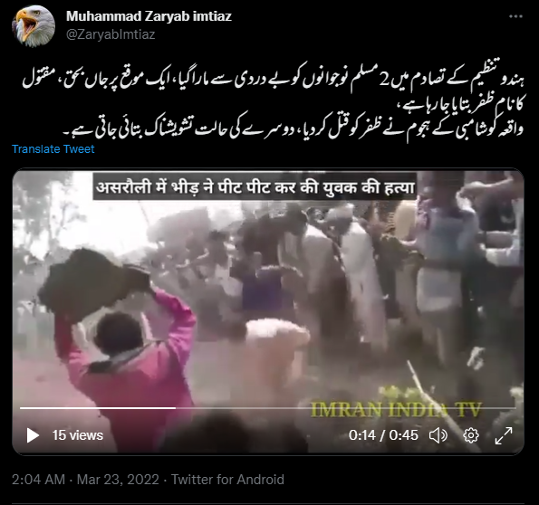 ٹویٹر پر ایک ویڈیو کو کوشامبی میں ہوئے ہجومی تشدد کا بتاکر شیئر کیا جا رہا ہے۔ جس میں لوگوں کا ہجوم ایک شخص کو لاٹھی ڈنڈے اور لات گھوسوں سے مارتے ہوئے نظر آ رہا ہے۔ صارف نے ویڈیو کے کیپشن میں لکھا ہے”ہندو تنظیم کے تصادم میں 2 مسلم نوجوانوں کو بے دردی سے مارا گیا، ایک موقع پر جاں بحق، مقتول کا نام ظفر بتایا جا رہا ہے، واقعہ کوشامبی کے ہجوم نے ظفر کو قتل کردیا، دوسرے کی حالت تشویشناک بتائی جارہی ہے”۔
