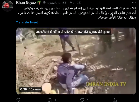 ٹویٹر پر ایک دوسرے صارف نے عربی کیپشن کے ساتھ ویڈیو کو شیئر کیا ہے، جس میں صارف نے ویڈیو کو کوشامبی میں پیش آئے ہجومی تشدد کا بتایا ہے۔