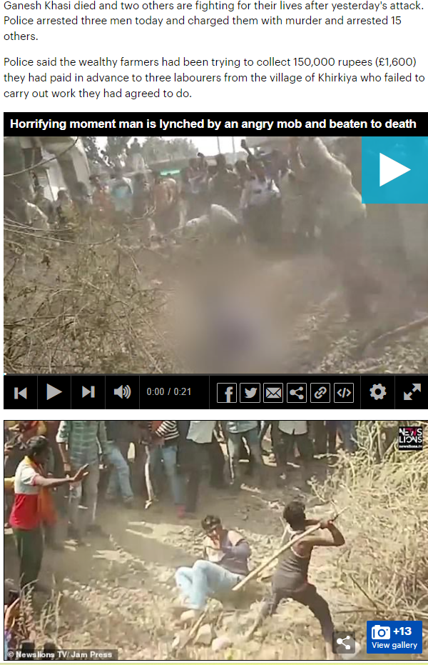 ڈیلی میل کے مطابق مدھیہ پردیش کے دھار ضلع میں پانچ کسانوں کو بچہ چوری کے الزام میں گاؤں کے لوگوں نے جم کر مارا پیٹا اور ان کی گاڑی کو بھی نقصان پہنچایا، مارپیٹ کے دوران ایک کسان کی موت بھی ہوگئی۔ رپورٹ میں یہ بھی واضح کیا گیا ہے کہ یہ کسان مزدوروں سے اپنا پیسا واپس لینے گئے تھے۔ جہاں ان کے خلاف افواہ پھیلائی گئی کہ وہ بچہ چوری کر رہے ہیں، جس کے بعد لوگوں کا ایک ہجوم ان پر لاٹھی ڈنڈے اور پتھروں کے ساتھ ٹوٹ پڑا۔ اس معاملے میں پولس 15 افراد کو گرفتار بھی کر چکی ہے۔