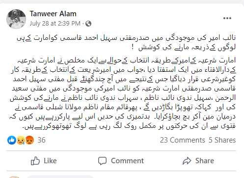 سوشل میڈیا پر گذشتہ کچھ دنوں سے امارت شرعیہ کے صدر مفتی سہیل احمد قاسمی کے حوالے سے ایک خبر خوب گشت کر رہی ہے۔ صارفین کا دعویٰ ہے کہ “امارت شرعیہ کے امیر کے طریقہ انتخاب کے حوالے سے ایک مخلص نے امارت شرعیہ کے دارالافتاء میں استفتا دیا، جواب میں امیر شریعت کےانتخاب کےطریقہ کار کو غیرشرعی قرار دیا گیا، جس کےنتیجے میں مفتی سہیل احمد قاسمی صدر مفتی امارت شرعیہ کو نائب امیر کی موجودگی میں مفتی سعید الرحمن ،سہیل ندوی نائب ناظم ، سہراب ندوی نائب ناظم نے مارنےکی کوشش کی اور کہا کہ تھوبڑا بگاڑ دیں گے، پھر قائم مقام ناظم مولانا شبلی قاسمی نے درمیان میں آکر بیچ بچاؤ کرایا۔