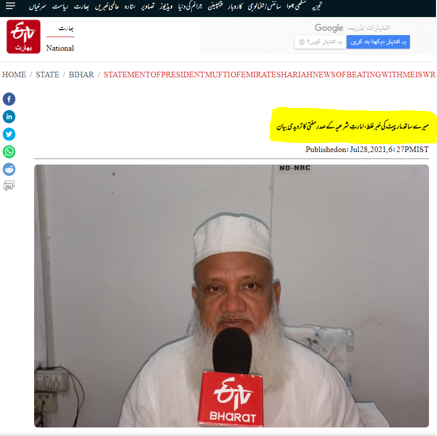 امارت شرعیہ کے صدر مفتی سہیل قاسمی کے ساتھ مار پیٹ کے حوالے سے وائرل پوسٹ کی سچائی جاننے کےلئے ہم نے اپنی تحقیقات کا آغاز کیا۔ سب سے پہلے ہم نے وائرل پوسٹ سے متعلق کچھ کیورڈ سرچ کیا۔ اس دوران ہمیں ای ٹی وی بھارت اردو پر شائع 28 جولائی 2021 کی ایک خبر ملی۔ رپورٹ کے مطابق ای ٹی وی کے نمائندے نے ان سے مل کر وائرل دعوے سے متعلق سوال کیا تو انہوں نے بتایا کہ سوشل میڈیا پر جو دعویٰ کیا جا رہا ہے کہ میرے ساتھ امارت کے کارکنان نے مار پیٹ کی ہے اور جان سے مارنے کی دھمکی دی ہے وہ سراسر غلط ہے۔