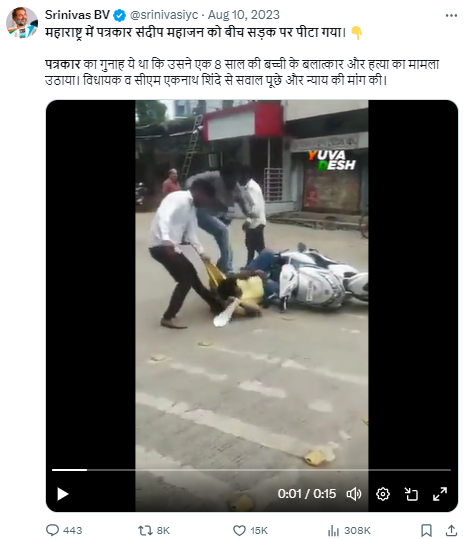 اسکوٹی سوار فرد کی پٹائی والی ویڈیو کے ایک فریم کو ہم نے گوگل ریورس امیج سرچ کیا۔ جہاں ہمیں انڈیا یوتھ کانگریس کے قومی صدر سری نیواس کی جانب سے 10 اگست 2023 کو شیئر شدہ ہوبہو ویڈیو ملی۔ جس کے مطابق ویڈیو میں جس اسکوٹی سوار کی پٹائی کی جا رہی ہے وہ مہاراشٹر کے صحافی سندیپ مہاجن ہیں۔