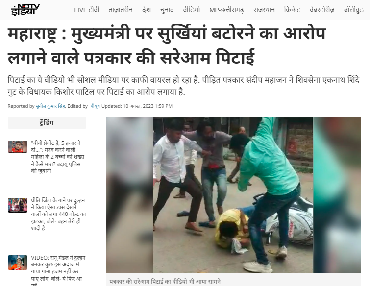 مزید سرچ کے دوران ہمیں 10 اگست 2023 کو شائع شدہ این ڈی ٹی وی کی ایک رپورٹ ملی۔ جس کے مطابق جلگاؤں کے صحافی سندیپ مہاجن نے شیو سینا ایکناتھ شندے گروپ کے ایم ایل اے کشور پر پٹائی کا الزام لگایا تھا۔ صحافی نے وزیر اعلیٰ شندے پر 8 سالہ بچی کی عصمت دری معاملے پر سرخیاں بٹورنے کا الزام لگایا تھا۔ جس کے بعد ایم ایل اے کشور پاٹل نے صحافی کو فون پر غلیظ گالیاں دی تھی۔