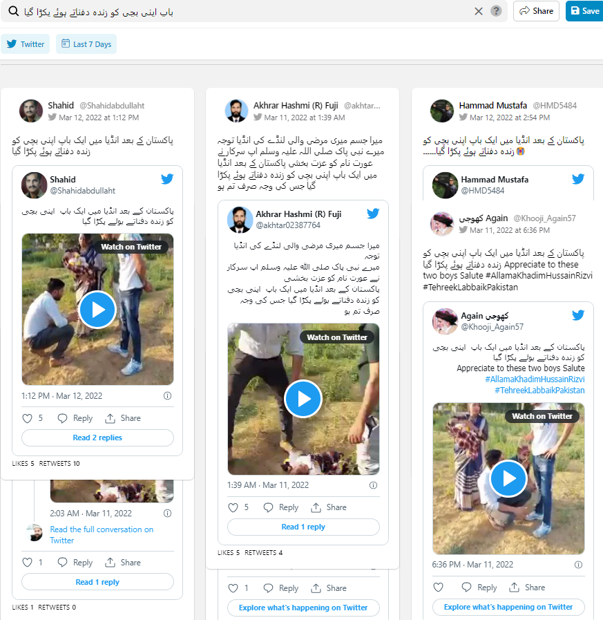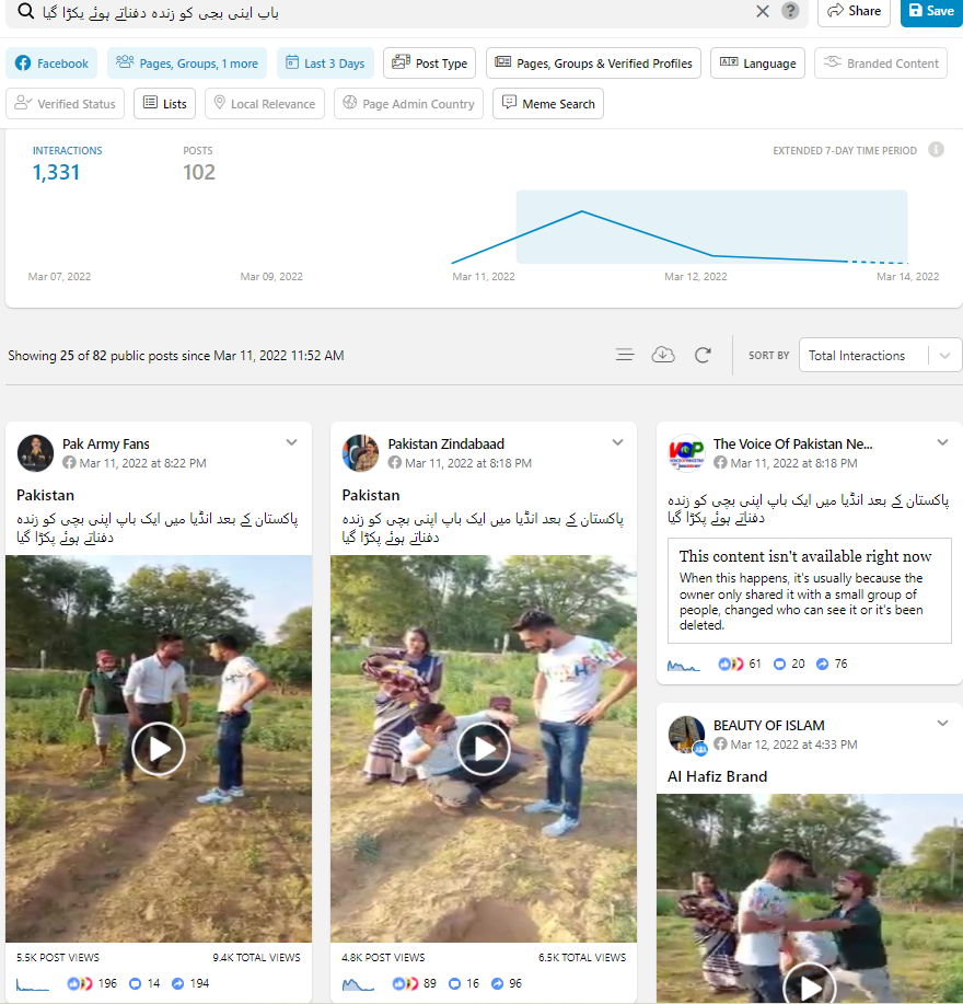 فیس بک پر مذکورہ دعوے کے ساتھ شیئر کی گئی ویڈیو کو کتنے صارفین نے پوسٹ کیا ہے، یہ جاننے کے لئے ہم نے کراؤڈ ٹینگل پر کیورڈ سرچ کیا تو ہمیں پتا چلا کہ اس موضوع پر پچھلے 3 دنوں میں 102 پوسٹ شیئر کئے گئے ہیں اور 1,331 فیس بک صارفین نے اس موضوع پر تبادلہ خیال کیا ہے۔ ٹویٹر پر بھی اس ویڈیو کو نومولود بچی کو زندہ دفنانے کا بتاکر صارفین نے شیئر کیا ہے۔