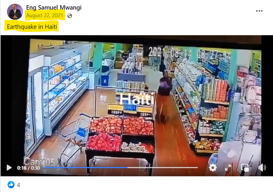 نیوزی لینڈ زلزلے کا بتاکر شیئر کی گئی ویڈیو کے ایک فریم کو گوگل ریورس سرچ کیا۔ جہاں ہمیں انجینئر سیموئیل مونگی نام کے فیس بک پیج پر 22 اگست 2021 کو شیئر شدہ ہوبہو ویڈیو ملی۔ جس میں اس ویڈیو کو ہیتی میں آئے زلزلے کا بتایا گیا ہے۔