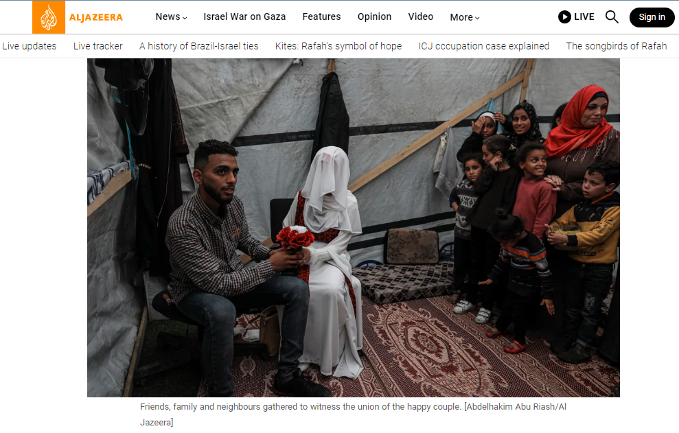 یہ تصویر غزہ کے البلاح میں فلسطینی نو بیاہتا جوڑے محمود اخزيق و شيماء قزاعة کی ہے اور دونوں باحیات ہیں۔