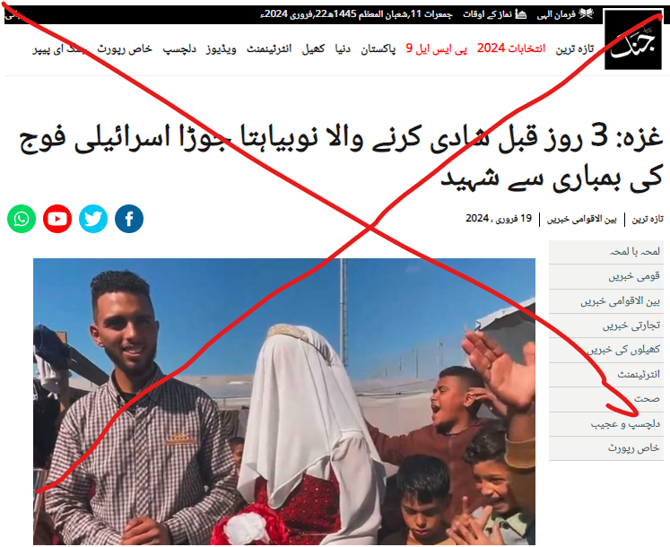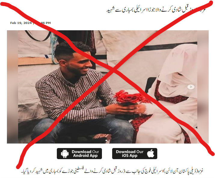 اس حوالے سے انہوں نے عرب فیکٹ چیکرس نٹورک کے ہی ایک دوسرے میمبر اور ‘تحقق’ کے بانی ایمان برق کا لکھا ہوا ایک فیکٹ چیک بھی بھیجا۔ جس میں یہ بتایا گیا ہے کہ وائرل تصویر میں نظر آ رہا نو بیاہتا جوڑا باحیات ہے اور اسرائیلی حملے میں ہلاک ہونے والا نو بیاہتا جوڑا مختلف ہے۔