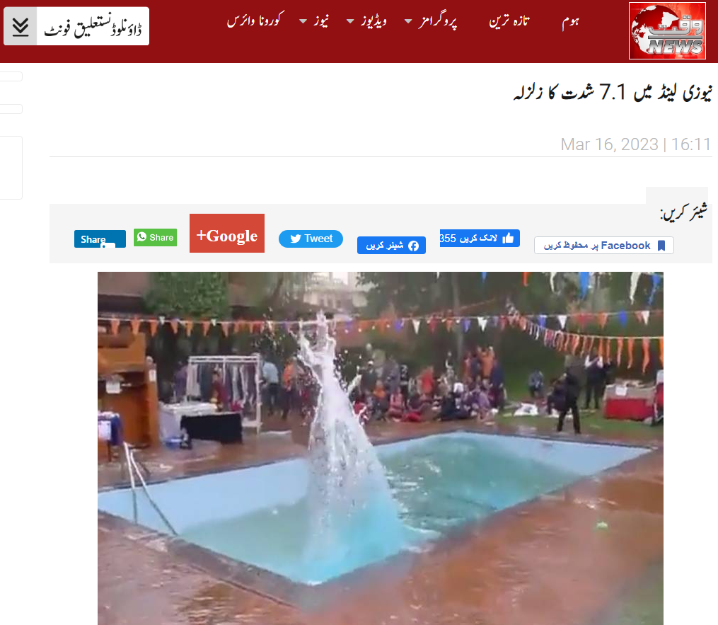 نیوزی لینڈ میں 16 مارچ کو 7.1 شدت کا زلزلے کا جھٹکا محسوس کیا گیا تھا۔ جس کے بعد سے سوشل میڈِیا پر مختلف ویڈیوز اور تصاویر کو فرضی دعوے کے ساتھ شیئر کیا جا رہا ہے۔ انہی میں ایک سوئمنگ پول کی ویڈِیو کو حالیہ نیوزی لینڈ زلزلے کا بتاکر شیئر کیا گیا ہے۔ ایک ٹویٹر صارف نے ہم نیوز ڈیجیٹل کی ویڈیو رپورٹ شیئر کرکے لکھا ہے کہ “16 مارچ 2023 کو نیوزی لینڈ میں زلزلہ”۔