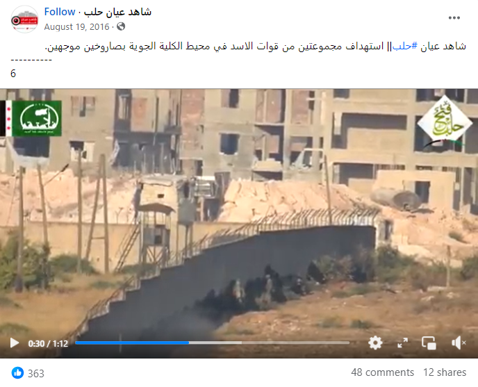 صیہونی فوجیوں کے گروپ پر القسام بریگیڈ کے حملے کی ویڈیو کے ایک فریم کو ہم نے گوگل ریورس امیج سرچ کیا۔ جہاں ہمیں 19 اگست 2016 کو شیئر شدہ شاھد عیان حلب نامی فیس بک پیج پر ہوبہو ویڈیو ملی۔ جس کے مطابق یہ ویڈیو اسد فورسز کے دو گروپوں کو ایئر فورس کالج کے قریب دو میزائلوں سے نشانہ بنانے کا ہے۔