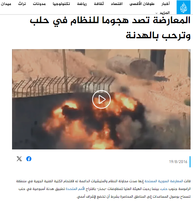 مزید سرچ کے دوران ہمیں اسی ویڈیو کے ساتھ اگست 2016 کو شائع ہونے والی الجزیرہ کی ویب سائٹ پر ایک رپورٹ موصول ہوئی۔ جس کے مطابق یہ ویڈیو مُلک شام کے حلب کے رموسہ میں واقع ایئر ٹیکنیکل کالج پر کئے گئے حملے کی کوشش کی ہے۔