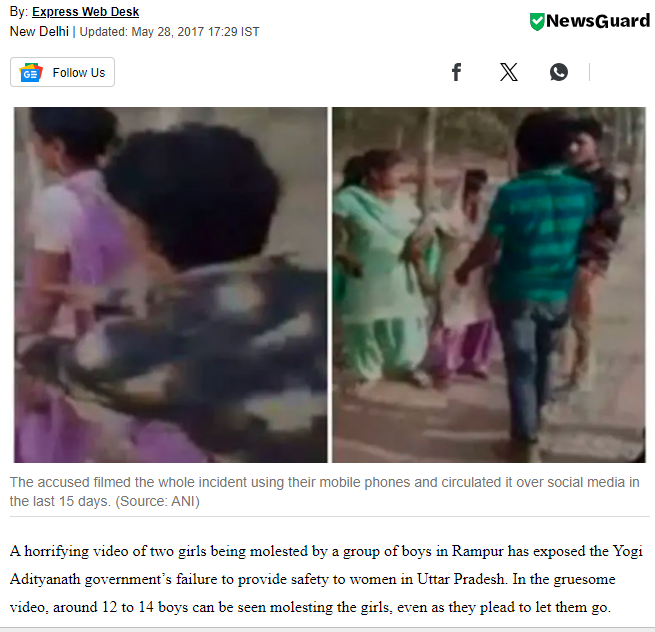 مسلمان خواتین کو ہراساں کرنے کا بتاکر شیئر کی گئی ویڈیو کو ہم نے کچھ ٹولس کی مدد سے تلاشا۔ جہاں ہمیں ہوبہو ویڈیو کے ساتھ 28 مئی 2017 کو شائع انڈیا ٹی وی، انڈین ایکس پریس اور ٹائم آف انڈیا کی رپورٹس موصول ہوئیں۔ ان رپورٹس کے مطابق ویڈیو اترپردیش کے رام پور کے ٹانڈا کی ہے۔ جہاں 12 سے 14 لڑکوں نے دو خواتین کو سرِ راہ ہراساں کیا تھا۔