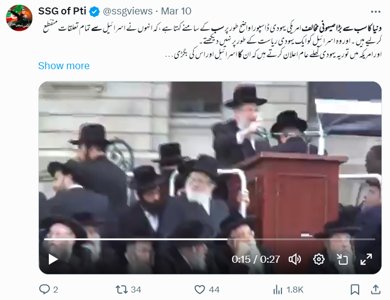 ایک فیس بک صارف نے ویڈیو کے ساتھ کیپشن میں لکھا ہے کہ “امریکہ میں اسرائیل مخالف یہودی کمیونٹی کا دوسرا بڑا اجتماع۔ جس نے قابض اسرائیل کی مخالفت اور اس کے ساتھ تمام تعلقات منقطع کرنے کا اعلان کردیا”۔