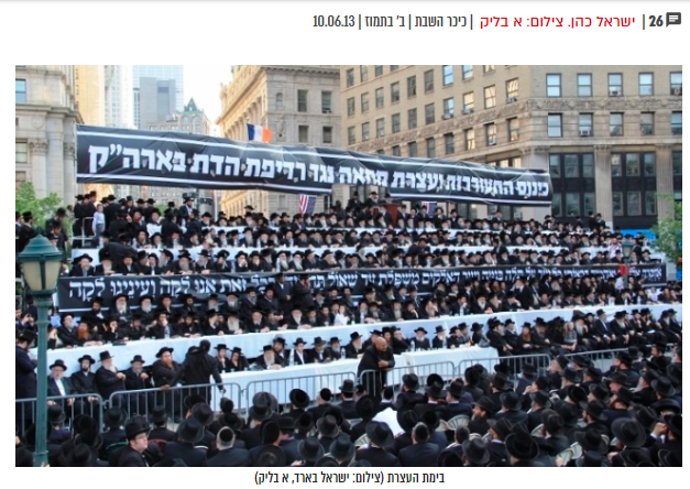 مزید سرچ کے دوران ہمیں 17 جون 2013 کو اپلوڈ شدہ یہی ویڈیو بیچتس روسسٹمار نامی یوٹیوب چینل پر موصول ہوا۔ جس کے عنوان کے مطابق 100,000 سے زیادہ آرتھوڈوکس یہودی پہر 9 جون 2013 کو لوئر مین ہٹن کے فولے اسکوائر میں اسلئے جمع ہوئے تاکہ اسرائیلی حکومت کی جانب سے اپنے ہم مذہبوں کو فوج میں شامل کرنے کے فیصلے کے خلاف احتجاج کرسکیں۔ جس میں یہودیوں کے بڑے بڑے رہنماؤں کی شرکت ہوئی تھی۔ اس حوالے سے دیگر میڈیا رپورٹس یہاں اور یہاں پڑھی جا سکتی ہیں۔