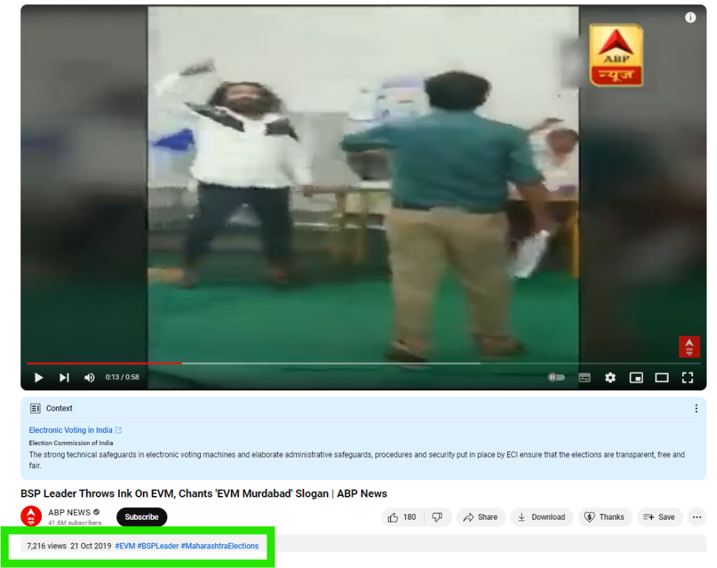 ای وی ایم پر سیاہی پھینکنے کا بتا کر شیئر کی ویڈیو کی تحقیقات کے لئے سب سے پہلے ہم نے “مین تھروز”، “اینک” اور ” ای وی ایم” انگریزی کیورڈ یوٹیوب پر سرچ کیا۔ اس دوران ہمیں 21 اکتوبر 2019 کو شائع اے بی پی نیوز کی ایک رپورٹ ملی۔ اس رپورٹ میں وائرل ویڈیو کا مختصر ورژن بھی استعمال کیا گیا، جس کے ساتھ فراہم کردہ معلومات کے مطابق “تھانے میں بہوجن سماج پارٹی کے رہنما، سونیل کھامبے نے مہاراشٹر اسمبلی انتخابات کی ووٹنگ کے دوران پولنگ بوتھ پر ای وی ایم پر سیاہی پھینک دی۔ انہوں نے “ای وی ایم مردہ آباد” و “ای وی ایم نہیں چلےگا” جیسے نعرے بھی لگائے۔ بعد میں پولس انہیں پولس اسٹیشن بھی لے گئی”۔