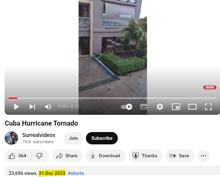 فریم 1: ویڈیو کے پہلے فریم کو ہم نے ریورس امیج سرچ کیا، اس دوران ہمیں سر ریل ویڈیوز نامی یوٹیوب چینل پر 31 دسمبر 2023 کو اپلوڈ شدہ ویڈیو ملی۔ جس میں اسے کیوبا میں آئے ہریکین ٹورناڈو کا بتایا گیا ہے۔