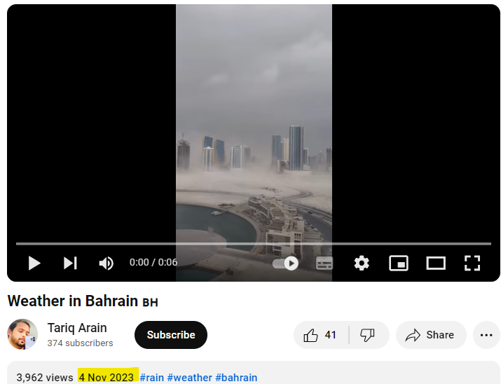 فریم 6: ویڈیو کے چھٹے فریم میں نظر آنے والے مناظر کو 4 نومبر 2023 کو طارق عرین نامی یوٹیوب چینل پر اپلوڈشدہ دیکھا جا سکتا ہے، جسے بحرین کا بتایا گیا ہے۔