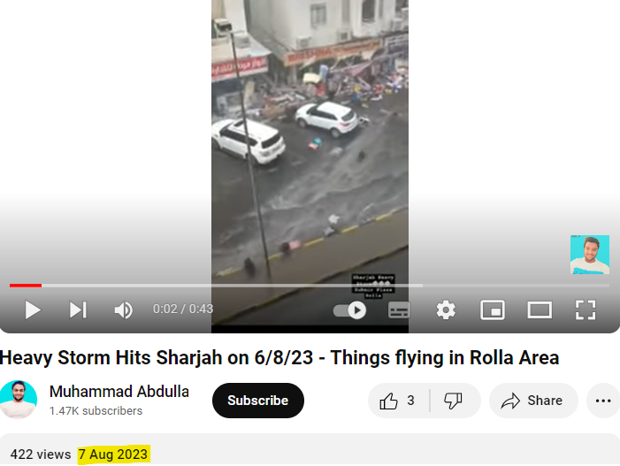 فریم 8: محمد عبد اللہ نامی یوٹیوب چینل پر آٹھویں فریم میں نظر آ رہے مناظر کی ویڈیو 7 اگست 2023 کو شیئر کی گئی تھی۔ ویڈیو کے ساتھ فراہم کردہ معلومات کے مطابق یہ ویڈیو شارجاہ میں 6 ۱گست 2023 کو آنے والے طوفان کی ہے۔