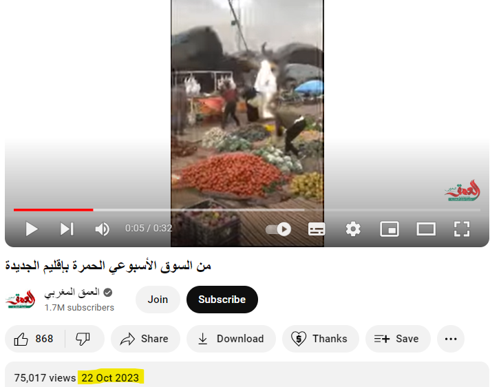 فریم 10: سبزی منڈی میں آئے طوفان کی ویڈیو کو سرچ کرنے پر ہمیں العمق المغربی نامی یوٹیوب چینل پر 22 اکتوبر 2023 کو اپلوڈ شدہ ویڈیو ملی۔