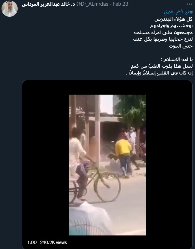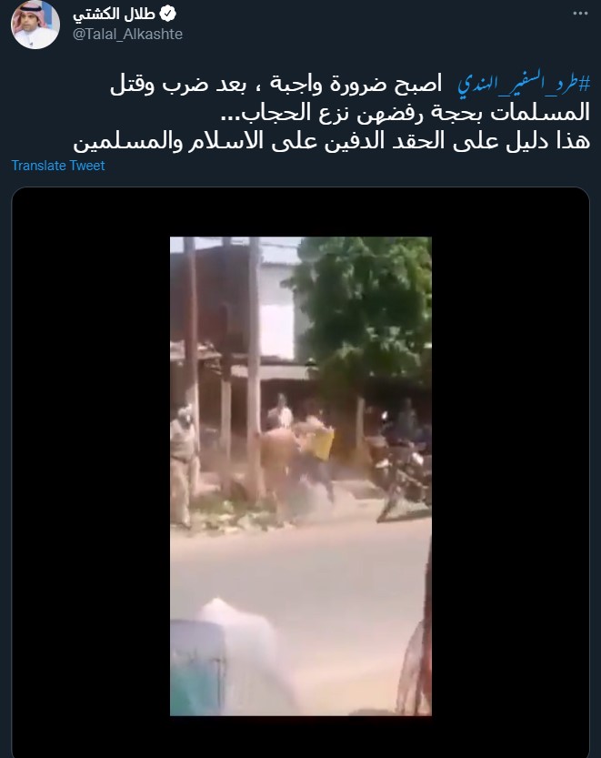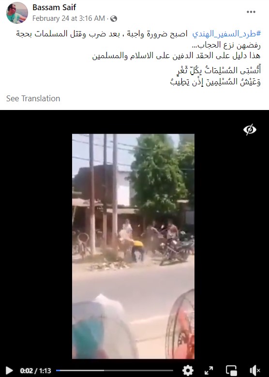 ویڈیو کے کیپشن میں عربی زبان میں “#طرد_السفير_الهندي اصبح ضرورة واجبة ، بعد ضرب وقتل المسلمات بحجة رفضهن نزع الحجاب…هذا دليل على الحقد الدفين على الاسلام والمسلمين” لکھا ہے۔ “