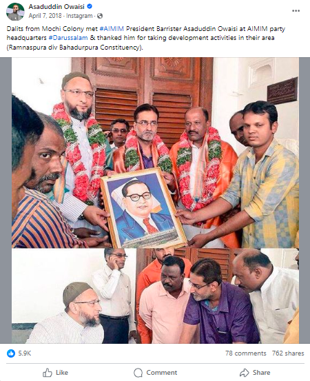 تصویر کے ساتھ دی گئی معلومات کے مطابق موچی کالونی کے دلت طبقہ کے لوگوں نے مجلس اتحادالمسلمین کے ہیڈکوارٹر دارالسلام میں اسدالدین اویسی سے ملاقات کی اور ان کا شکریہ ادا کیا۔