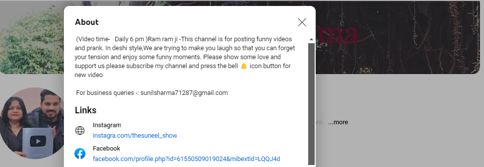 اس کے علاوہ یہی ویڈیو سنیل کے آفیشل یوٹیوب چینل دی سنیل شو پر 17 مئی 2024 کو بھی اپلوڈ کی گئی تھی۔ جس سے واضح ہوتا ہے کہ وائرل ویڈیو کا پاکستانی کرکٹ مداح، کرکٹ میچ یا کسی قومی ایونٹ سے کوئی تعلق نہیں ہے۔ البتہ ہم نے دی سنیل شو نامی اس یوٹیوب چینل کے “اباؤٹ سیکشن” کو دیکھا تو معلوم ہوا کہ اس چینل پر دیسی انداز میں مضحکہ خیز اور پرینک ویڈیو پوسٹ کی جاتی ہیں۔
