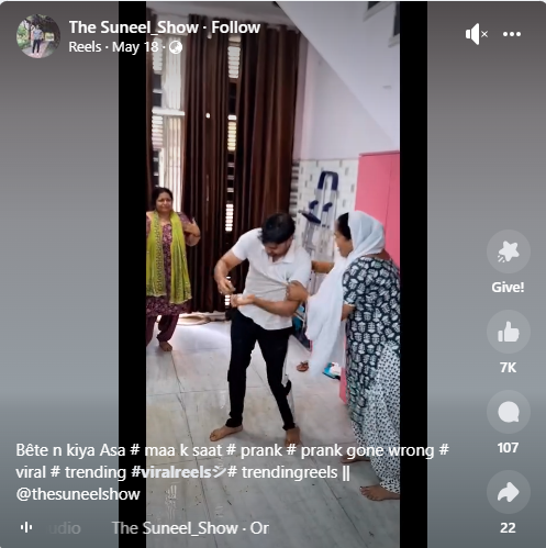 ہم نے ویڈیو کے ایک فریم کو گوگل ریورس امیج سرچ کیا۔ جہاں ہمیں 18 مئی 2024 کو شیئر شدہ دی سنیل شو نامی فیس بک پیج پر ہوبہو ویڈیو ملی۔ جس کے مطابق یہ ویڈیو ماں کے ساتھ بیٹے کی جانب سے کیا گیا پرینک(مزاق) ہے۔