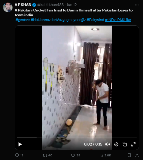 سوشل میڈیا پر انگلش اور ہندی کیپشن کے ساتھ ایک ویڈیو شیئر کی جا رہی ہے، جس میں ایک شخص اپنے اوپر مائع جیسی شئ ڈالتا ہے اور اس کے بعد خود کو ماچس سے جلانے کی کوشش کرتا ہے، اردگرد موجود خواتین اسے بچانے کی کوشش کرتی ہوئی نظر آ رہی ہیں۔ صارفین کا دعویٰ ہے کہ 9 جون کو ٹی20 ورلڈ کپ میں بھارت سے پاکستان کی شکست کے بعد پاکستانی مداح نے خود کو جلانے کی کوشش کی ہے۔