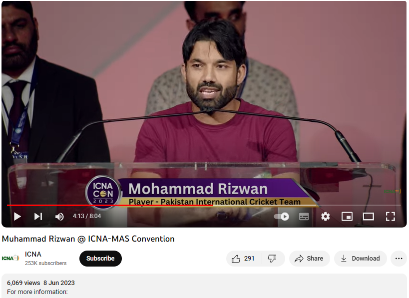 پاکستانی کرکٹر محمد رضوان کے تبلیغی بیان والی ویڈیو کی حقیقت جاننے کے لئے سب سے پہلے ہم نے یوٹیوب پر “محمد رضوان اسپیچ” انگلش میں کیورڈ سرچ کیا۔ جہاں ہمیں 8 منٹ 4 سیکینڈ پر مشتمل 8 جون 2023 کو اپلوڈ شدہ ہوبہو ویڈیو آئی سی این اے نامی یوٹیوب چینل پر ملی۔ جس میں اس ویڈیو کو آئی سی این اے کے ماس کنونشن میں پاکستانی کرکٹر محمد رضوان کے خطاب کا بتایا گیا ہے۔