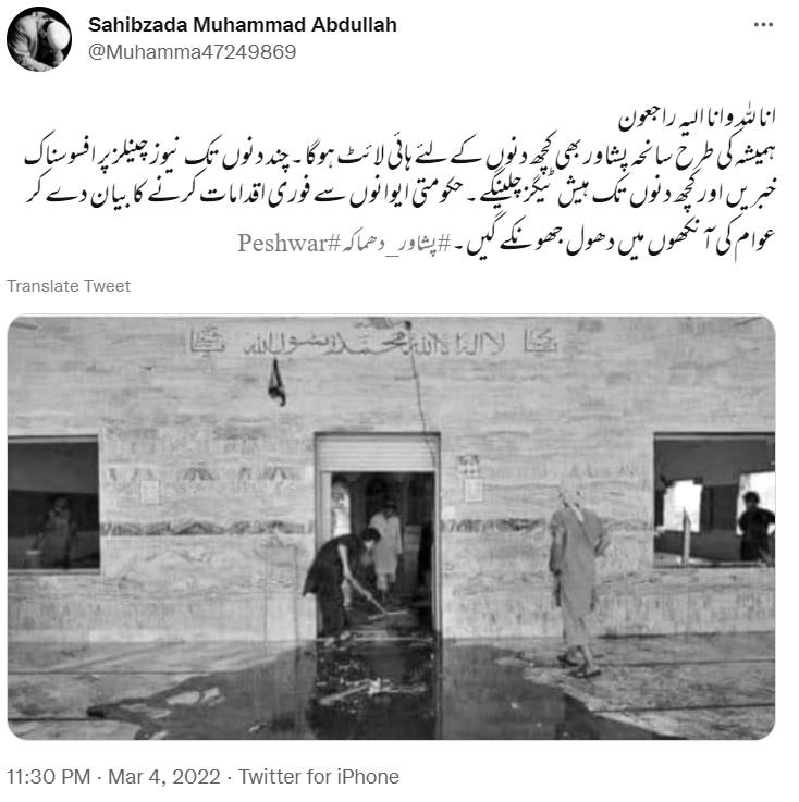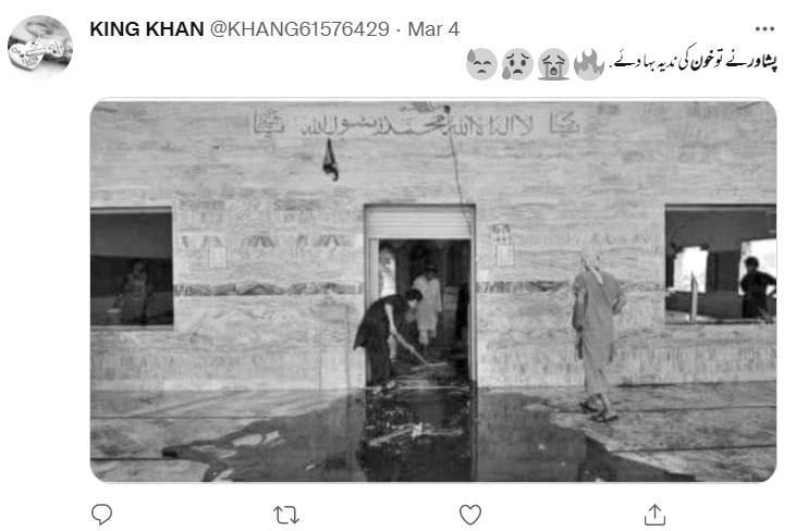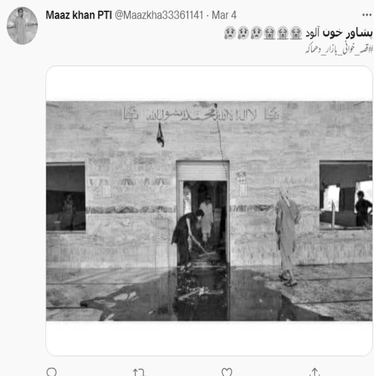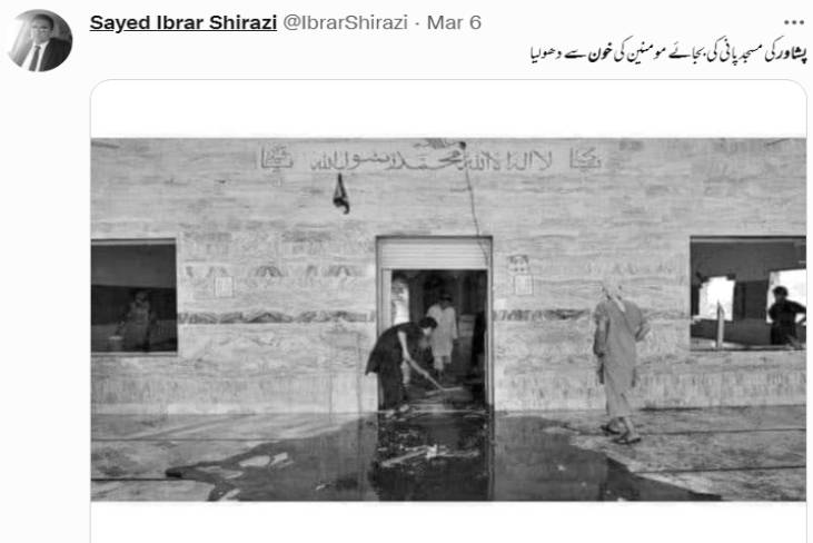 سوشل میڈیا پر ایک تصویر کو پشاور کی شیعہ مسجد میں ہوئے دھماکے سے جوڑ کرشیئر کی جا رہی ہے۔ ٹٖویٹر پر ایک صارف نے فرش پر لگے خون کو دھو رہے لوگوں کی وائرل تصویر کے کیپشن میں لکھا ہے کہ “پشاور کی مسجد پانی کی بجائے مؤمنوں کی خون سے دھو لیا”۔