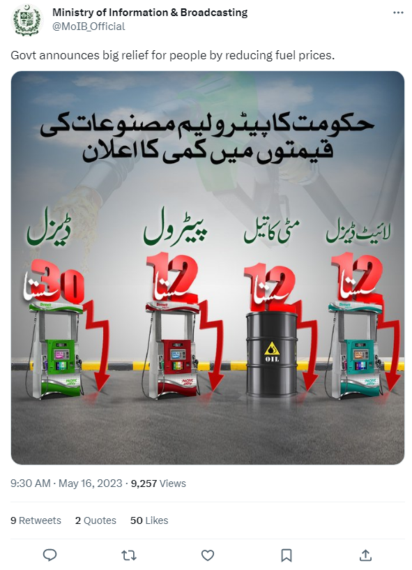 16 مئی 2023 کو شیئر شدہ وزیر خزانہ اسحاق ڈار کا ایک ٹویٹ ملا۔ جس میں پاکستانی حکومت کا پیٹرولیم مصنوعات کی قیمتوں میں کمی کا اعلان کیا گیا ہے۔ لائٹ ڈیزل، مٹی کا تیل اور پیٹرل 12 روپے فی لیٹر سستا کیا گیا ہے، جبکہ ڈیزل فی لیٹر 30 روپے سستا کیا گیا ہے۔