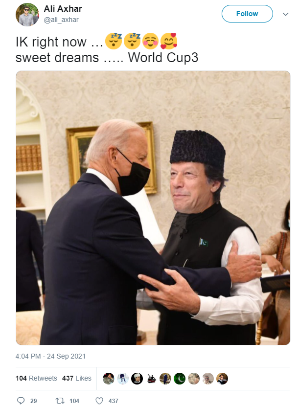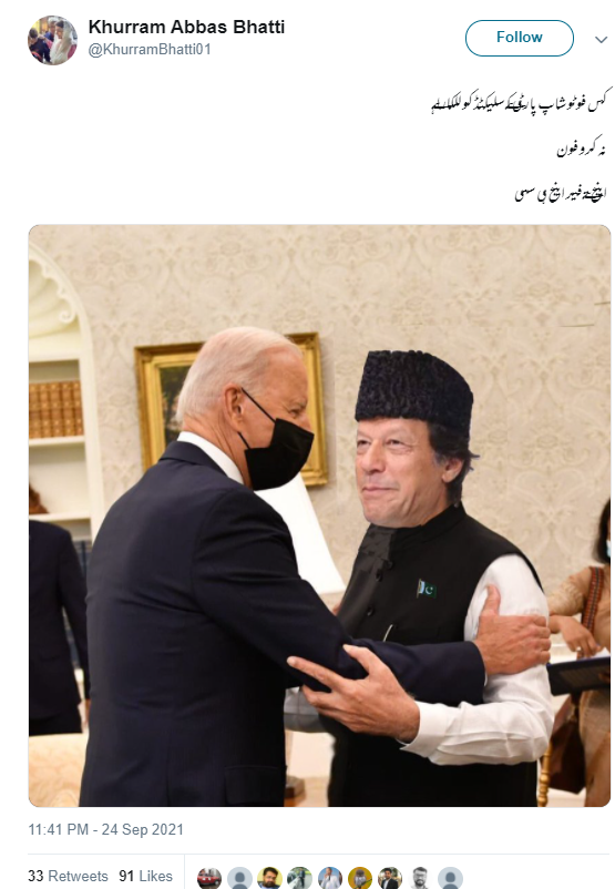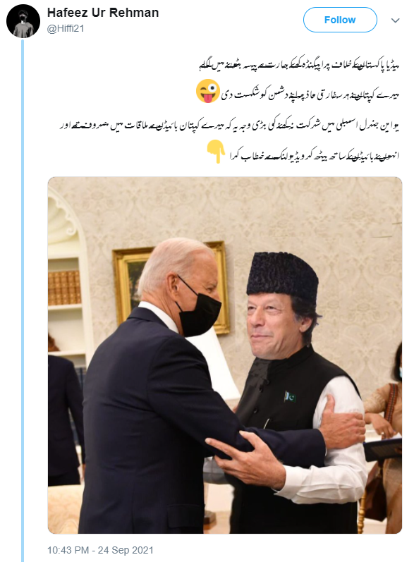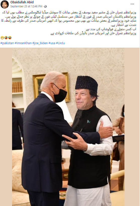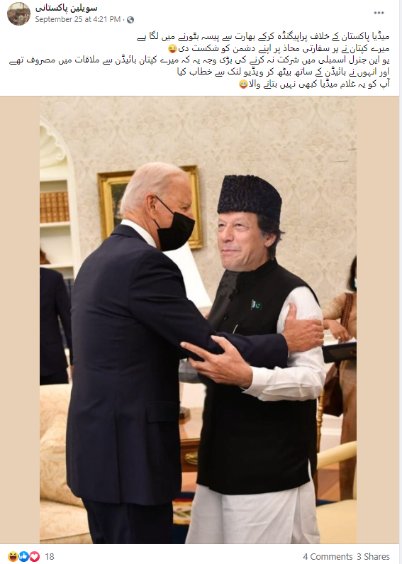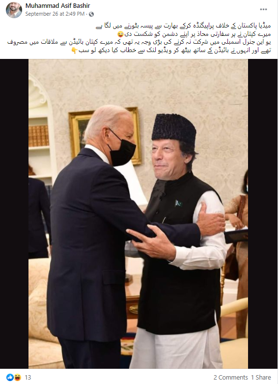 سوشل میڈیا پر ان دنوں امریکی صدر جوبائیڈن کے ساتھ پاک پی ایم عمران خان کی تصویر کو مختلف دعوے کے ساتھ شیئر کیا جا رہا ہے۔ ایک صارفین کا دعویٰ ہے کہ “یو این جنرل اسمبلی میں شرکت نہ کرنے کی بڑی وجہ یہ ہے کہ میرے کپتان بائیڈن سے ملاقات میں مصروف تھے”۔