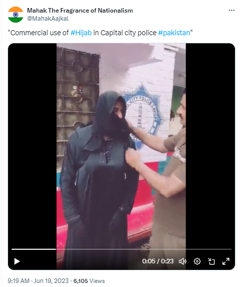 پھر ہم نےا یک فریم کے ساتھ کیورڈ سرچ کیا۔ جہاں ہمیں مہک آج کل نامی ایکس ہینڈل پر 19 جون 2023 کو شیئر شدہ ہوبہو ویڈیو ملی۔ جس میں اس ویڈیو کے ساتھ طنزیہ انداز میں لکھا ہے ” پاکستان کے کیپٹل سٹی پولس میں حجاب کا کمرشیل استعمال”۔