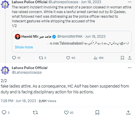 مزید سرچ کرنے پر ہمیں لاہور کیپٹل سٹی پولس کی جانب سے پاکستانی صحافی حامد میر کے ٹویٹ کے جواب میں انگریزی زبان میں لکھا گیا ایک ٹویٹ ملا۔ جس کا ترجمہ ہے کہ “خاتون کے لباس میں ملبوس ایک شخص کی گرفتاری کے اس واقعے نے تشویش میں اضافہ کر دیا ہے۔ اگرچہ یہ ایس آئی قادر کی جانب سے کی گئی ایک جائز گرفتاری تھی، لیکن اس کے بعد جو ہوا وہ پریشان کن تھا، کیونکہ پولیس افسر نے مرد کے جسم سے عورت کا لباس ہٹاتے ہوئے فحش اشارے کئے تھے۔ جس پر ہیڈ کانسٹیبل آصف کو ڈیوٹی سے معطل کر کے تادیبی کارروائی کی گئی”۔