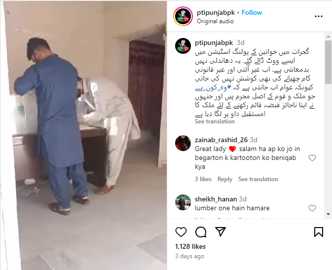 اس ویڈیو کو پاکستان تحریک انصاف کے الگ الگ سوشل میڈیا ہینڈل سے بھی شیئر کیا گیا ہے اور پاکستان کے گجرات کے ایک پولنگ اسٹیشن میں ووٹ دھاندلی کا بتایا گیا ہے۔ پی ٹی آئی نے انتظامیہ پر اس ضمنی الیکشن میں دھاندلی کا بھی الزام لگایا ہے۔