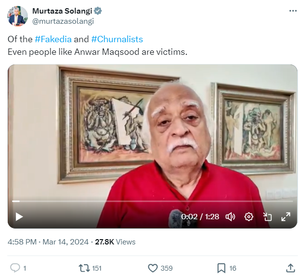 پاکستان کے سابق وفاقی وزیر اطلاعات و نشریات مرتضٰی سولنگی نے بھی 14 مارچ 2024 کو انور مقصود کی ایک ویڈیو اپنے ٹویٹر ہینڈل پر شیئر کی تھی، جس میں انور مقصود نے خود کے اغوا اور تشدد کے دعوے کو جھوٹا قرار دیا ہے۔