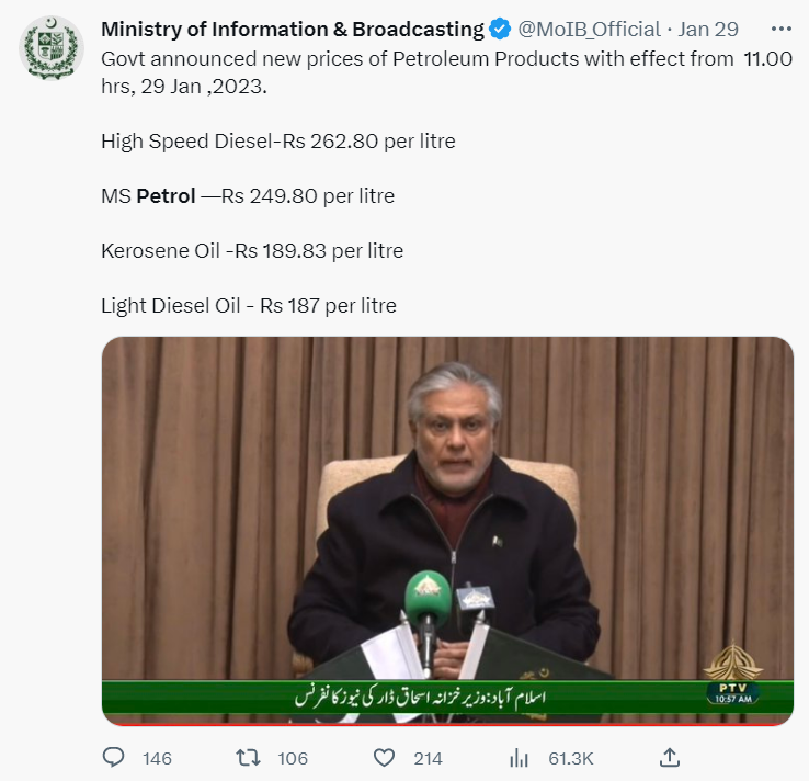 پاکستان کی سرکاری ویب سائٹ آئل اینڈ گیس ریگولیٹری اتھارٹی پر بھی یہ جانکاری دی گئی ہے۔ وہیں 29 جنوری 2023 کو شیئر شدہ پاکستان کے وزیر خزانہ اسحاق ڈار کا ایک ٹویٹ ملا۔ جس میں بھی ہائی اسپیڈ ڈیزل کی قیمت 262 روپے 80 پیسے اور پٹرول کی قیمت 249 روپے 80 پیسے بتائی گئی ہے۔