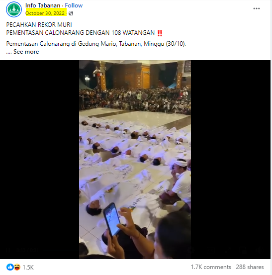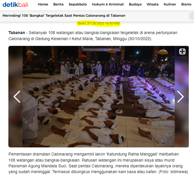 پھر ہم نے “کالونارنگ پرفارمنس تبانان” کیورڈ سرچ کیا۔ جہاں ہمیں مالے زبان میں اکتوبر 2022 کو شائع بالی ٹریبیون اور دیتک بالی نامی نیوز ویب سائٹ کی رپورٹس موصول ہوئیں۔ جس سے معلوم ہوا کہ یہ ویڈیو 30 اکتوبر 2022 کو تابانان، بالی کے کیتوت ماریہ آرٹ بلڈنگ میں ہونے والے ایک پروگرام کی ہے۔ کٹنڈنگ رتن منگ گلی نامی ڈرامہ پر مبنی کالونارنگ ڈانس پرفارمنس میں 108 طالب علم شامل تھے، جو کہ سسیا یا پارسامن اگنگ منڈلس سوکی کے تھے۔ پرفارمنس کے دوران ان کے ساتھ مُردوں جیسا برتاؤ کیا گیا تھا، جس میں دھند میں یا کفن میں لپیٹ دینا بھی شامل تھا۔