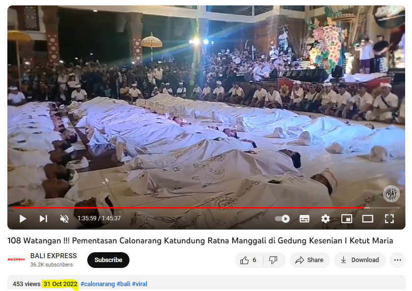 اس کے علاوہ انڈونیشیائی اخبار کے بالی ایکسپریس کے یوٹیوب چینل پر کالونارنگ پروگرام کی پوری ویڈیو ملی۔ جس میں ہوبہو وائرل ویڈیو جیسے مناظر دیکھے جا سکتے ہیں۔