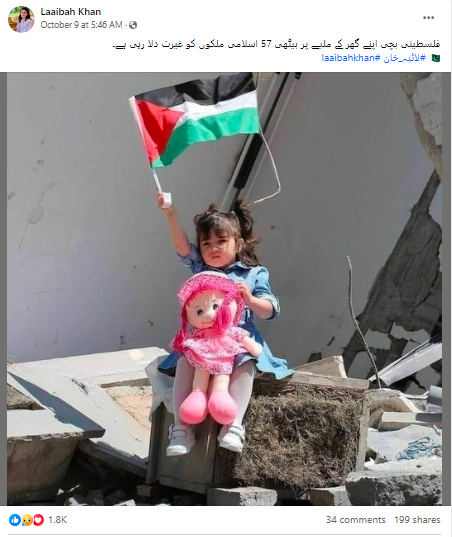 فلسطینی پرچم لئے ملبے پر بیٹھی بچی کی ایک تصویر کو حالیہ اسرائیل کے فلسطین پر کئے گئے حملے سے منسوب کرکے خوب شیئر کیا جا رہا ہے۔ ایک ایکس صارف نے تصویر کے کیپشن میں لکھا ہے کہ “ایک فلسطینی بچی اپنے گھر کے ملبے پر بیٹھی 57 اسلامی ممالک کے سربراہان کو غیرت دلا رہی ہے#طوفان الأقصى”۔