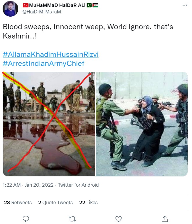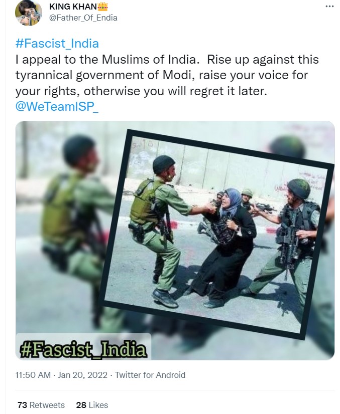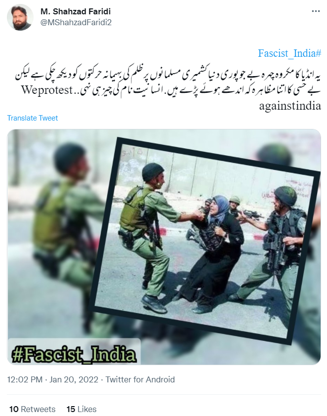 ٹویٹر پر ایک دوسرے صارف نے خاتون پر پولس زیادتی کی اس تصویر کو بھارتی کشمیری مسلم سے جوڑ کر شیئر کیا ہے۔ صارف نے کیپشن میں ہیش ٹیگ فیسسٹ انڈیا کے ساتھ لکھا ہے کہ “یہ انڈیا کا مکروہ چہرہ بے جو پوری دنیا کشمیری مسلمانوں پر ظلم کی بہیمانہ حرکتوں کو دیکھ چکی ہے، لیکن بے حسی کا اتنا مظاہرہ کہ اندھے ہوئے پڑے ہیں۔ انسانیت نام کی چیز ہی نہیں”۔