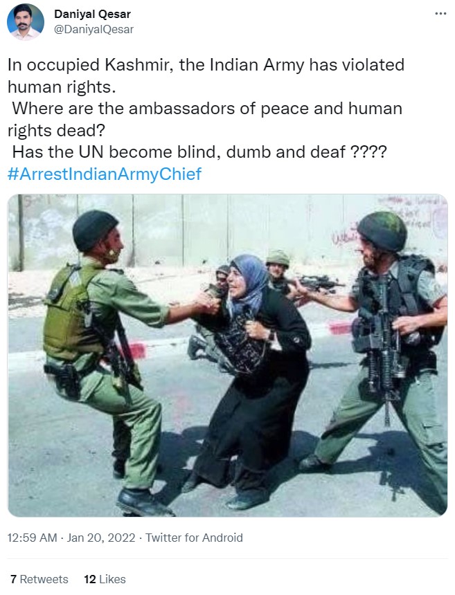 سوشل میڈیا پر خاتون پر پولس کی زیادتی کی ایک تصویر کو کشمیر میں بھارتی فوج کی ظلم و زیادتی کا بتاکر شیئر کیا جا رہا ہے۔ ٹویٹر صارف نے تصویر کے کیپشن میں لکھا ہے کہ “انڈین آرمی اور کشمیری عورت”۔