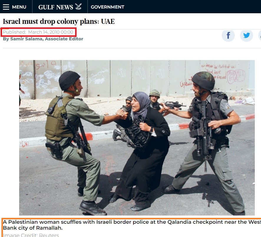 ہم نے کچھ انگلش کیورڈ سرچ کیا۔ اس دوران ہمیں گلف نیوز ویب سائٹ پر انگلش زبان میں 14 مارچ 2010 کی ایک رپورٹ ملی۔ اس رپورٹ میں تصویر کے کیپشن میں ریوٹرس کے حوالے سے لکھا ہے کہ”رام اللہ شہر کے مغربی کنارے کے نزدیک موجود قلندیہ چیک پوائنٹ پر ایک فلسطینی خاتون اسرائیلی سرحد پولس کے ساتھ جھڑپ کر رہی ہے”۔