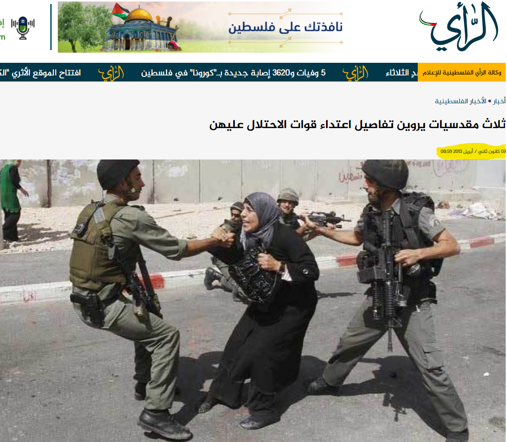 مذکورہ تحقیقات سے ہمیں ایک اشارہ ملا کہ تصویر کشمیر کی نہیں ہے۔ پھر ہم نے گوگل ریورس امیج سرچ کے ساتھ کچھ عربی کیورڈ سرچ کیا۔ اس دوران ہمیں عربی 21 اور الرّاَئی نیوز ویب سائٹس پر اپریل 2013 اور مارچ 2015 کو شائع شدہ خبریں ملیں۔ جس میں خاتون پر پولس کی زیادتی والی تصویر کو مقبوضہ یوروشلم کا بتایا گیا ہے۔ لیکن ان رپورٹس میں کہیں بھی واضح دلیل پیش نہیں کی گئی ہے۔
