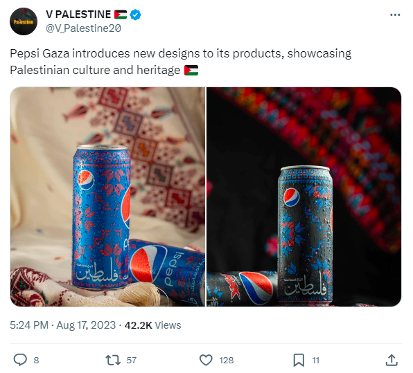 پیپسی ایک امریکی کمپنی ہے، پیپسی نے فلسطینی ثقافت کی عکاسی اور فلسطینی عوام کا شکریہ ادا کرنے کے لئے اپنے 2 نئے پروڈکٹس کو اگست 2023 میں نئی شکل میں لانچ کیا تھا، یہ “پیسی ٹیسٹ چیلنج” نامی ایک مہم کا حصہ تھا۔ یہ اسرائیل اور فلسطین تنازع سے قبل لانچ کیا گیا تھا۔