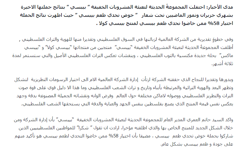 مزید سرچ کے دوران ہمیں فلسطینی نیوز ویب سائٹ مدی الاخبار پر شائع 14 اگست 2023 ایک خبر ملی۔ جس کے مطابق پیپسی نے رواں سال کے جون اور جولائی ماہ میں “پیپسی چیلنج کا ذائقہ لیں” کے نئے ڈیزائن اور سلوگن کے ساتھ مہم چلائی تھی، جس میں 58 فیصد لوگوں نے حصہ لیا تھا۔ جس کے بعد ماڈرن سافٹ ڈرنک بوٹلنگ گروپ ‘پیپسی’ کے جنرل منیجر حاتم العمری نے اس مہم میں شرکت کرنے والے فلسطینی عوام کا شکریہ بھی ادا کیا تھا۔