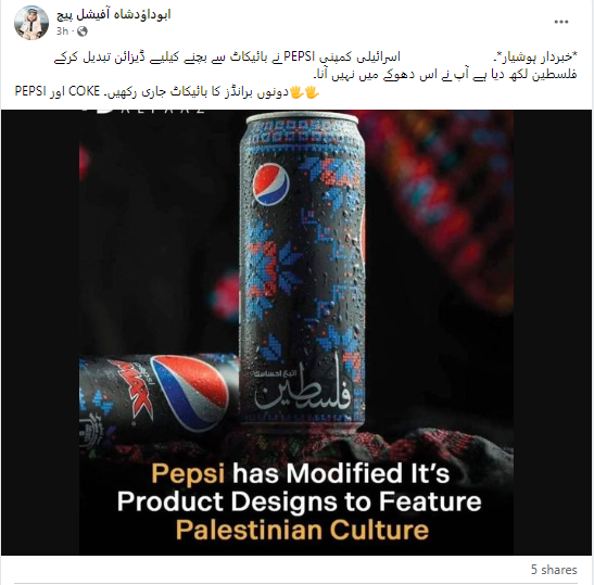 فلسطین پر اسرائیل کے جوابی حملے کے بعد سوشل میڈیا پر ایک طبقہ اسرائیلی اشیاء کا بائیکاٹ کر رہا ہے۔ اسی بیچ فیس بک اور ایکس پر پیپسی کے ایک کین کی تصویر وائرل ہو رہی ہے، جس پر “فلسطین اتبع احساسك” لکھا ہوا ہے۔ دعویٰ کیا جا رہا ہے کہ اسرائیلی کمپنی پیپسی نے بائیکاٹ سے بچنے کے لئے اپنی پیکیجنگ ڈیزائن تبدیل کرکے فلسطین لکھ دیا ہے، تاکہ مسلمان دھوکے میں آکر پیپسی کی خریداری نہ روکے۔