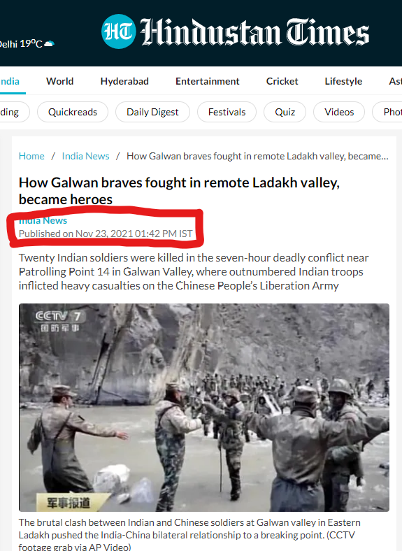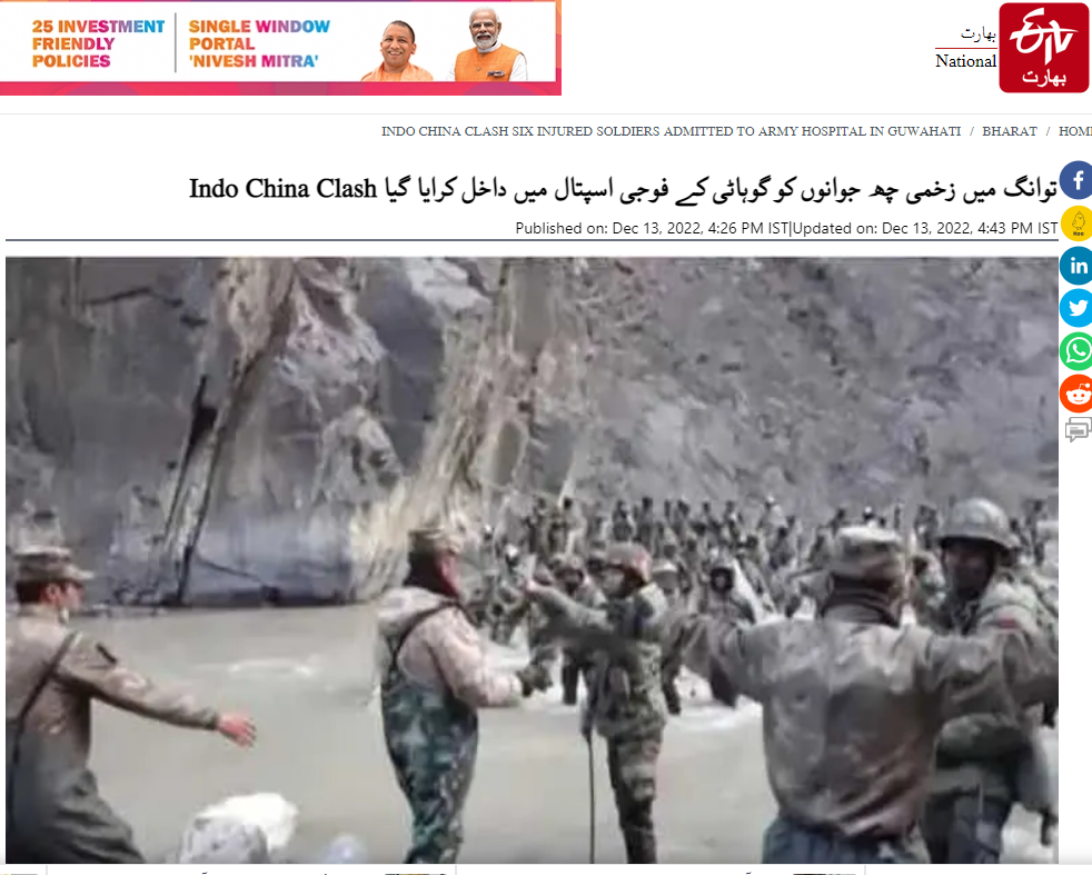 بھارت کے سب سے بڑا ڈیجیٹل میڈیا ادارہ کہلائے جانے والے ای ٹی وی بھارت نے ایک رپورٹ کے ساتھ تصویر شیئر کی ہے اور تصویر کے کیپشن میں لکھا ہے کہ ‘اروناچل پردیش کے توانگ میں 9 دسمبر کو چینی پیپلز لبریشن آرمی کے ساتھ جھڑپ کے دوران زخمی ہونے والے بھارتی فوج کے چھ فوجیوں کو گوہاٹی کے واششٹ میں واقع فوج کے 151 بیس اسپتال میں داخل کرایا گیا۔ موصولہ اطلاعات کے مطابق اس دوران دونوں ممالک کے فوجی زخمی ہوئے’۔